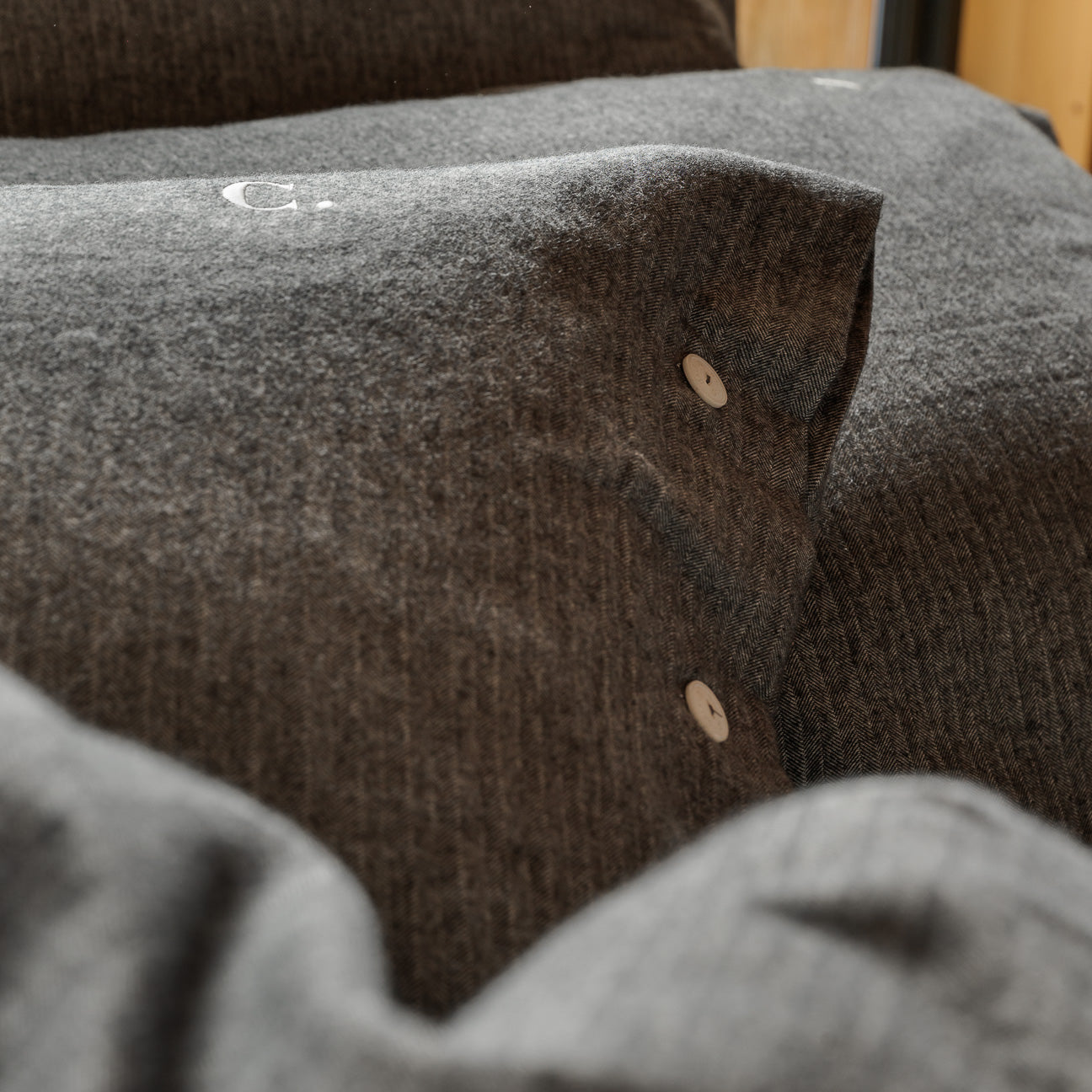 Il calore della flanella si fonde con la ricercatezza di trame senza tempo, dando vita a due intrecci unici: Crema, con la sua raffinata rigatura dai toni Marrone e Blu, e Antracite, con il suo elegante disegno a spiga, frutto dell'intreccio del filo Crema con quello Antracite. Due lavorazioni a telaio, realizzate con filati tinti in filo, per donare profondità e resistenza a colori destinati a durare nel tempo.